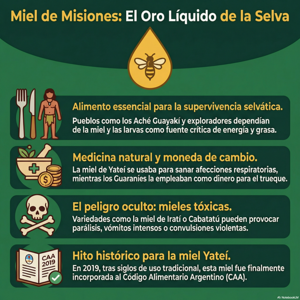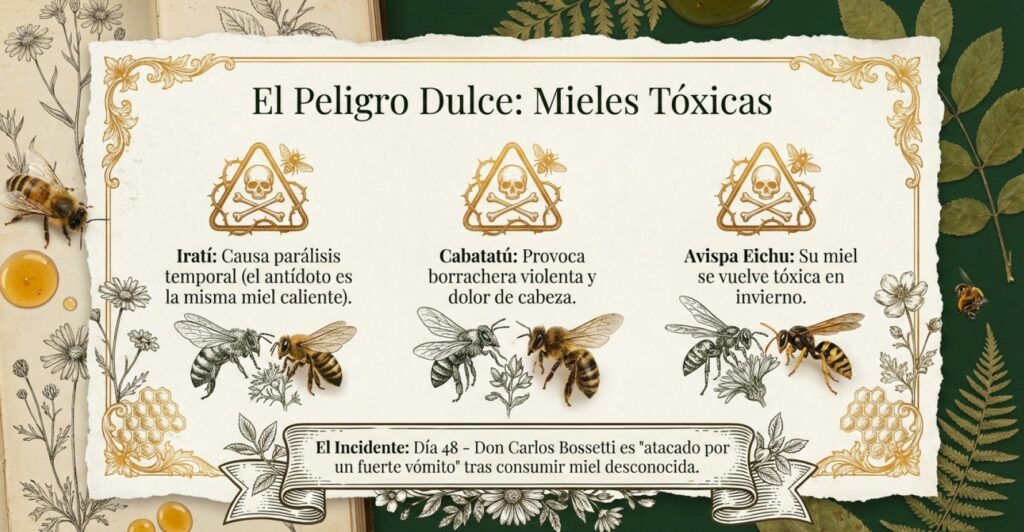La selva es generosa, pero también impone una pedagogía del peligro. El conocimiento indígena sobre las abejas incluía una clasificación farmacológica tan rigurosa que distinguía qué mieles eran elixires y cuáles eran venenos temporales. No toda miel silvestre es segura, y el monte misionero guarda variedades capaces de doblegar al hombre más fuerte.