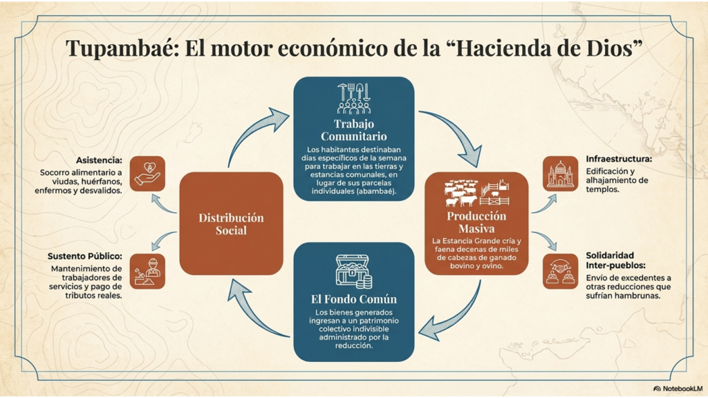 La Estancia Grande no era una empresa privada ni buscaba el lucro individual; era el corazón del Tupambaé (del guaraní Tupá: Dios y mbaé: cosa), que incluía sembradíos de todos y “Hacienda de todos”. Este sistema de propiedad comunal obligaba a los habitantes a dedicar días de trabajo al “común”, pero a cambio, el ganado de la estancia sostenía una red de seguridad social asombrosa para su época.