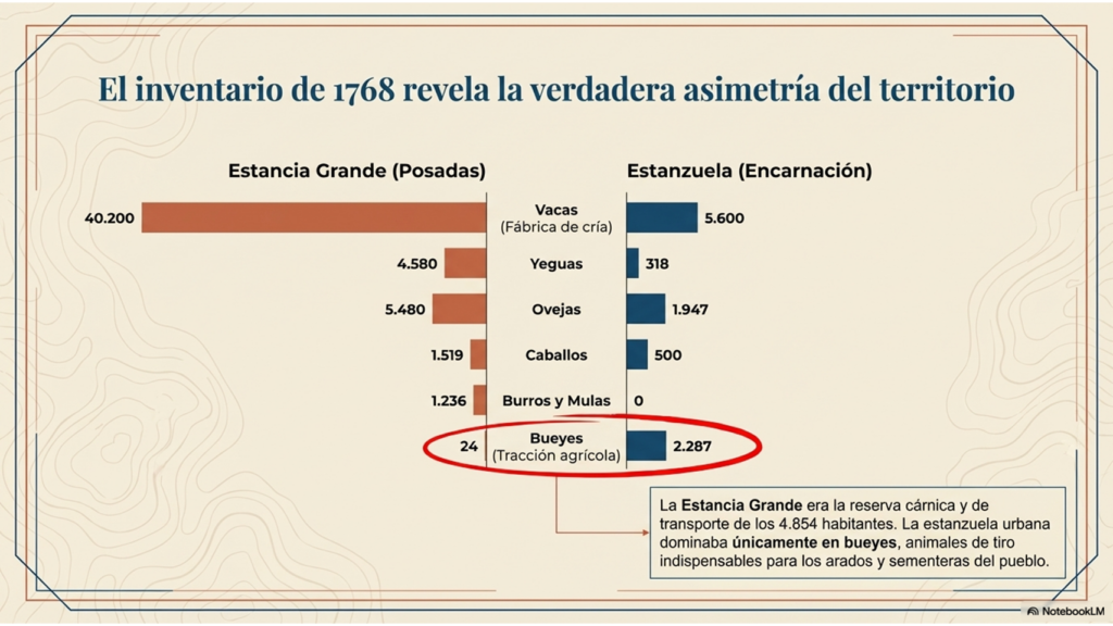 La escala de la Estancia Grande era masiva, y la prueba definitiva de su especialización reside en un detalle técnico del inventario realizado tras la expulsión de los jesuitas en 1768. Mientras que la “Estanzuela” del lado del pueblo (Encarnación) contaba con 2.287 bueyes —animales de tiro indispensables para el arado y la vida urbana—, la Estancia Grande en Posadas apenas tenía 24. Esta disparidad es la “evidencia reina”: un lado era el huerto y la ciudad; el otro era el campo dedicado exclusivamente a la cría de ganados, con bueyes solo para la mantención de chacras cultivadas en pequeña escala, para el auto abastecimiento de los peones de la estancia.