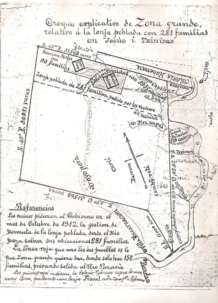 El poder de Palacios no se limitaba a la caja de su tienda; se extendía sobre la tierra misma a través del robo sistemático de propiedades fiscales. Bajo el nombre de “Zona Grande”, se consolidó un latifundio de 20 leguas que era solo una pieza del rompecabezas del expolio: Barthe controlaba 100 leguas y La Industrial Paraguaya otras 250.Sin embargo, el verdadero rostro de esta tragedia aparece en el “croquis explicativo” de la época, que muestra una lonja poblada por 281 familias en los distritos de Jesús y Trinidad . Estos pobladores, cuyas raíces se hundían en el suelo paraguayo, fueron despojados de su salida al río Paraná, quedando aislados y a merced de las “descabelladas cobranzas” de Palacios. El negocio era redondo y cruel: compraban tierras fiscales a 32 centavos la cuadra para luego exigir 100 pesos argentinos por el mismo pedazo de suelo. El cronista Bouvier lo describió con una imagen desoladora: los caminos, otrora transitados, estaban “casi borrados del todo” porque las amenazas de Palacios habían despoblado el departamento. Era la “inmoralidad administrativa” en su máxima expresión, una comparsa de “cuarenta contra uno”, similar al cuento de Alí Babá, donde los gobernantes saqueaban a su propia patria.