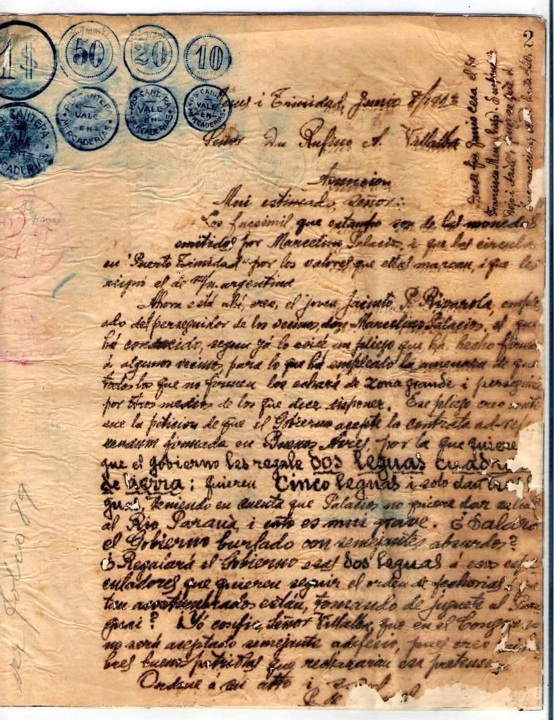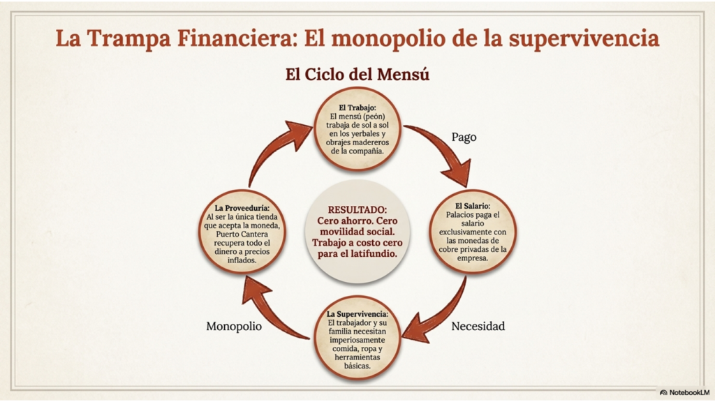 En El “Reino” Puerto Cantera —también conocido como Puerto Trinidad—, Palacios instauró un sistema de “moneda propia” que funcionaba como un grillete económico. Allí, el administrador despreciaba abiertamente el circulante nacional, exigiendo para el pago de arrendamientos únicamente papel moneda argentino o, en su defecto, sus propios “vales” de cobre.Estas fichas, acuñadas en valores de 0,10 a 5 pesos, portaban una inscripción que revelaba la perversión del sistema: “VALE EN MERCADERIAS” . No eran dinero, sino boletos de consumo obligatorio en la proveeduría de la empresa. Al pagar a los mensúes con estos metales, Palacios anulaba su libertad económica, encadenándolos a un mercado cautivo donde el patrón fijaba el precio del pan y del sudor. Como denunció Julián Bouvier, Palacios “fabricaba monedas argentinas” en su establecimiento, suplantando al Estado y pagando a sus peones con un metal que solo servía para devolverle el capital al mismo opresor.